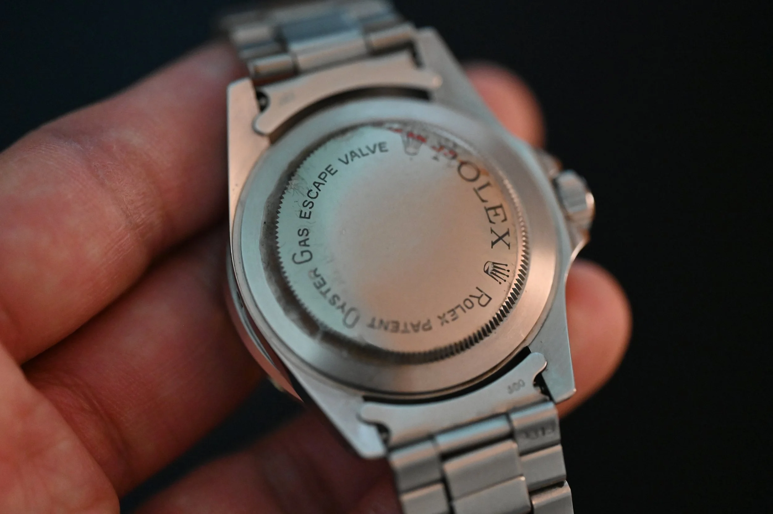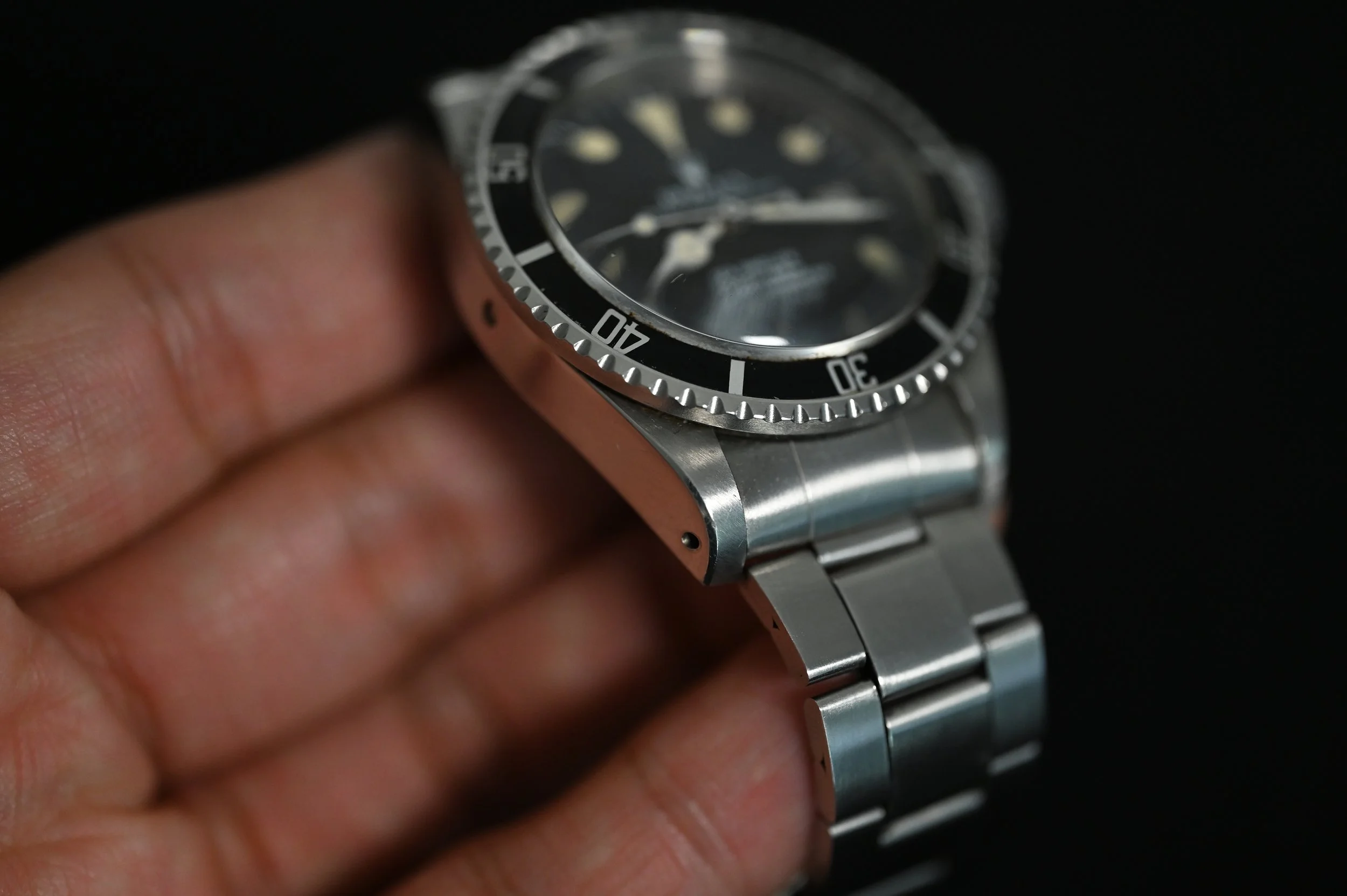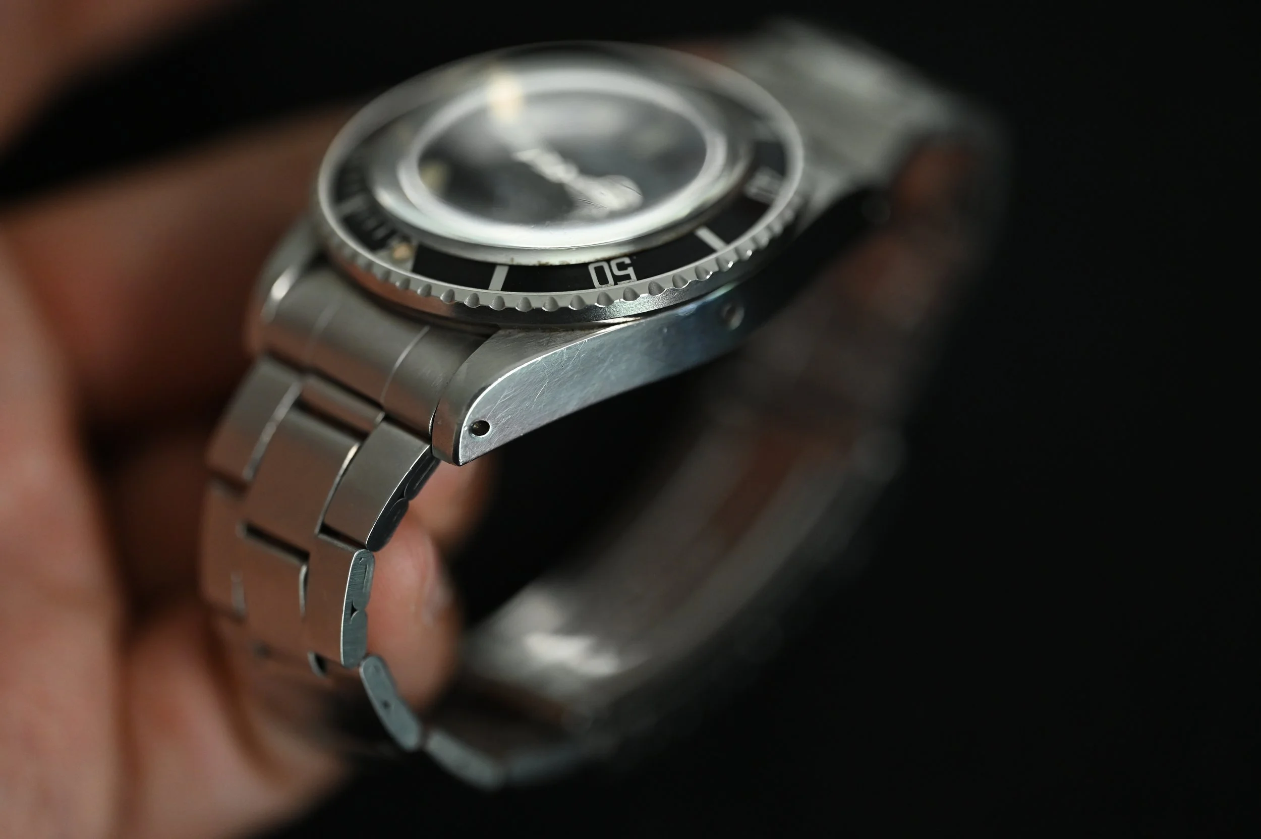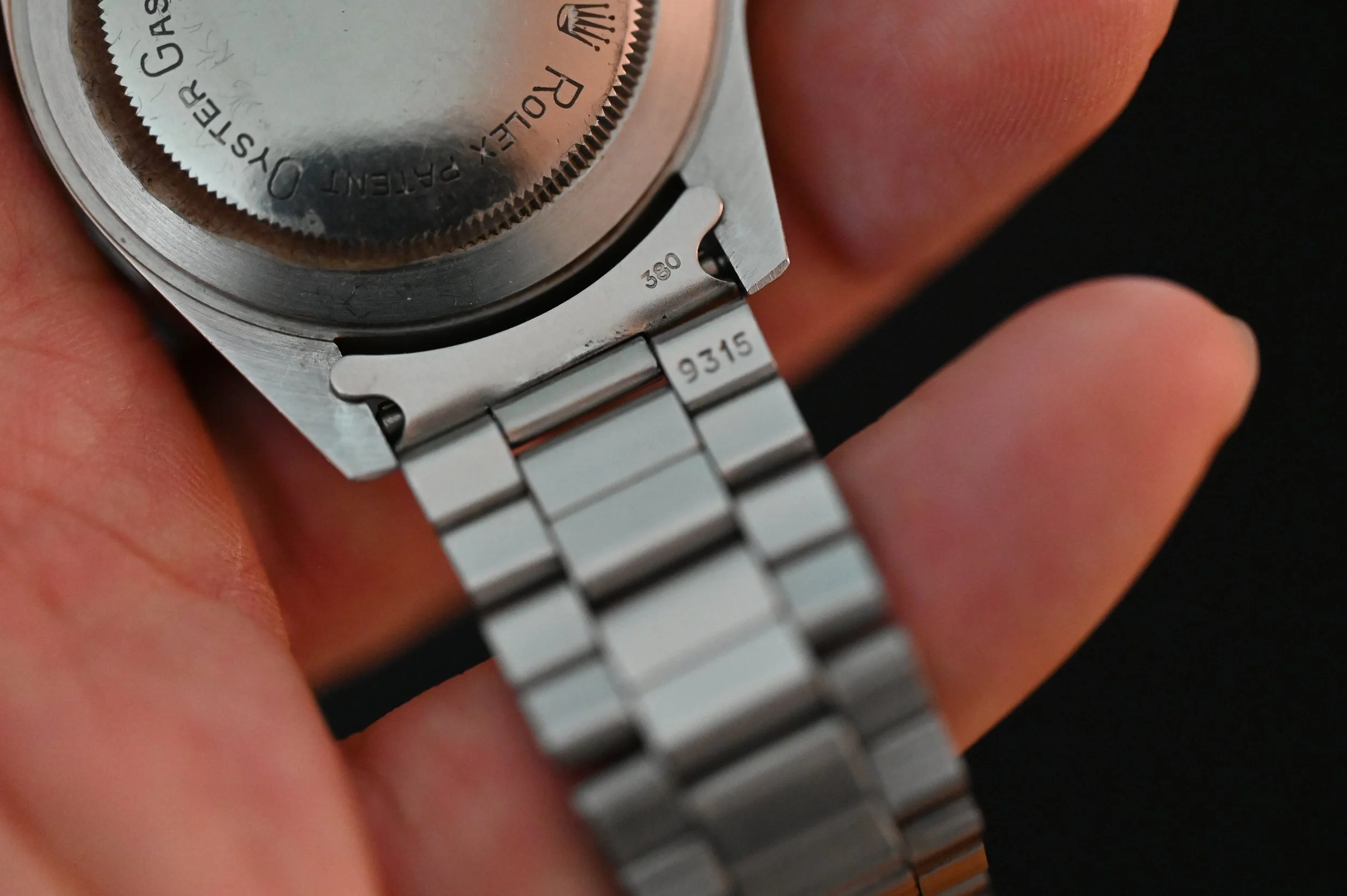 Over time by either normal wear or polishing, the black ink on the caseback engraving is most often worn off by, but this is not the case on this particular example. With most of the black ink intact, supporting the lack of wear and preservation this piece has sustained over the years. It comes on an original 9315 folded bracelet with 380 endlinks that’s in pristine condition as well.