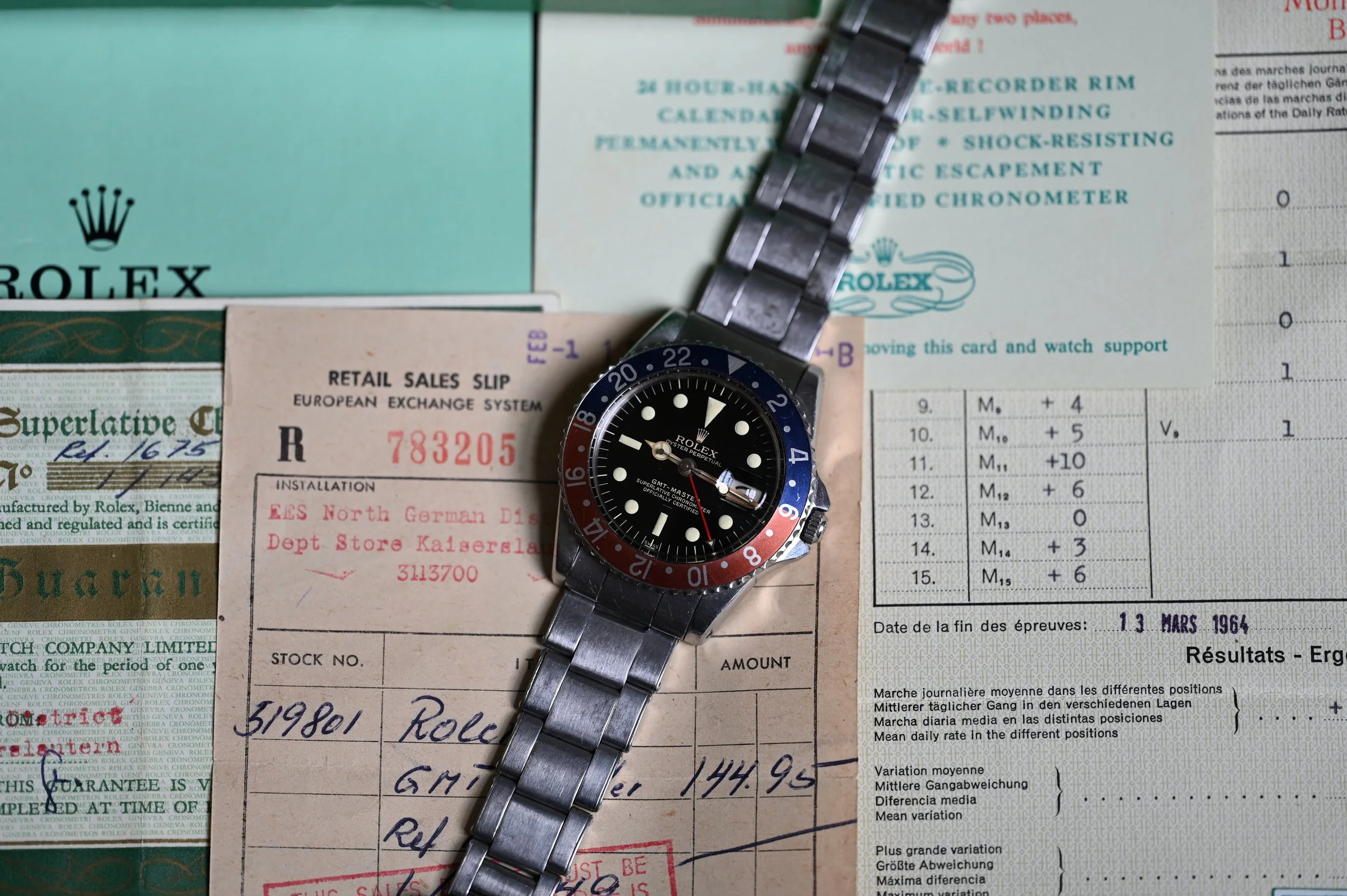 It's a real pleasure to come across such an attractive Double Swiss Underline GMT but more so when the original owner retained all its boxes and paper provenance. It’s most exciting to see the original invoice of $144.95 was paid for this example after the first month in 1965 from a US occupied military zone in North Germany.