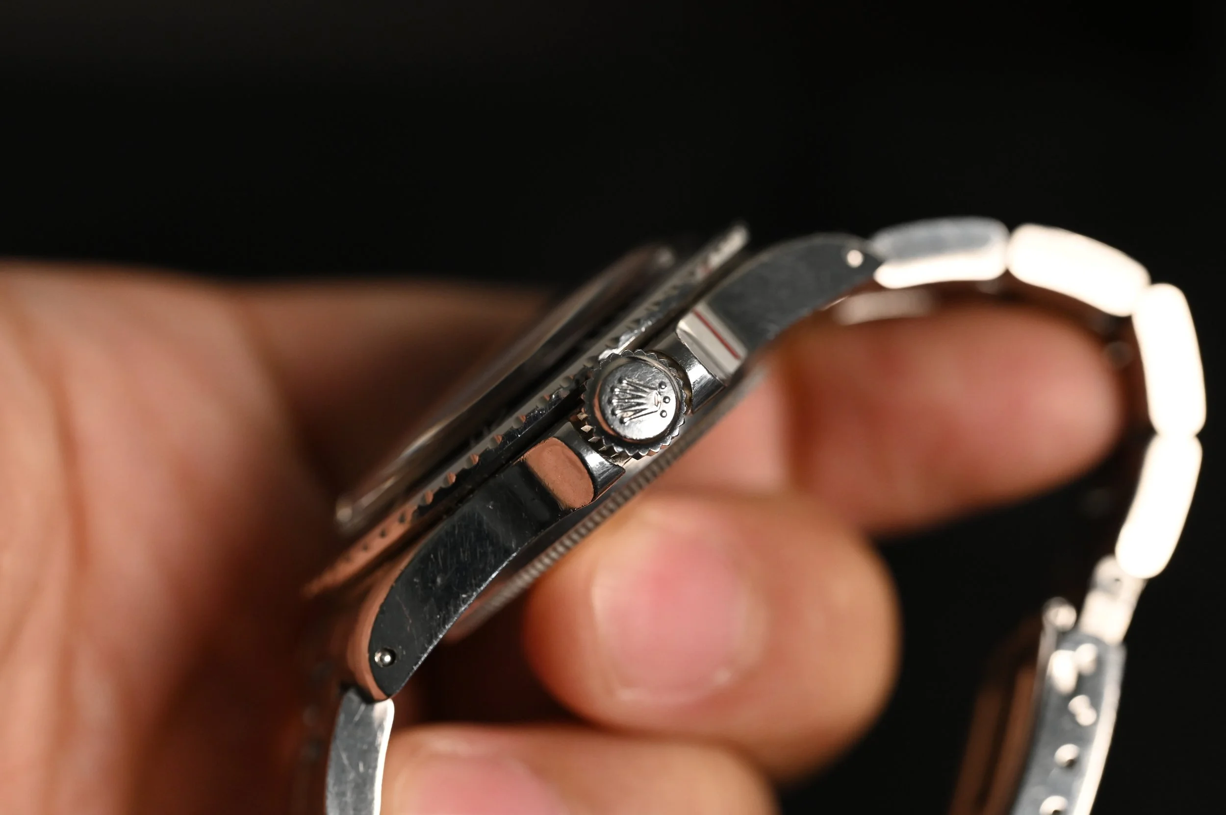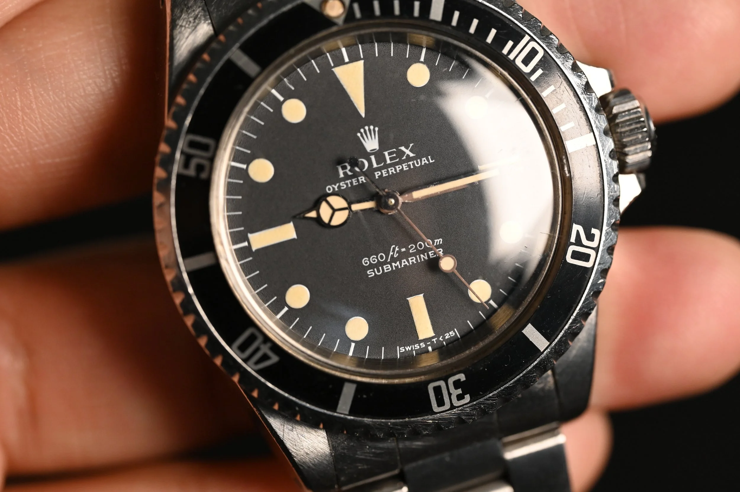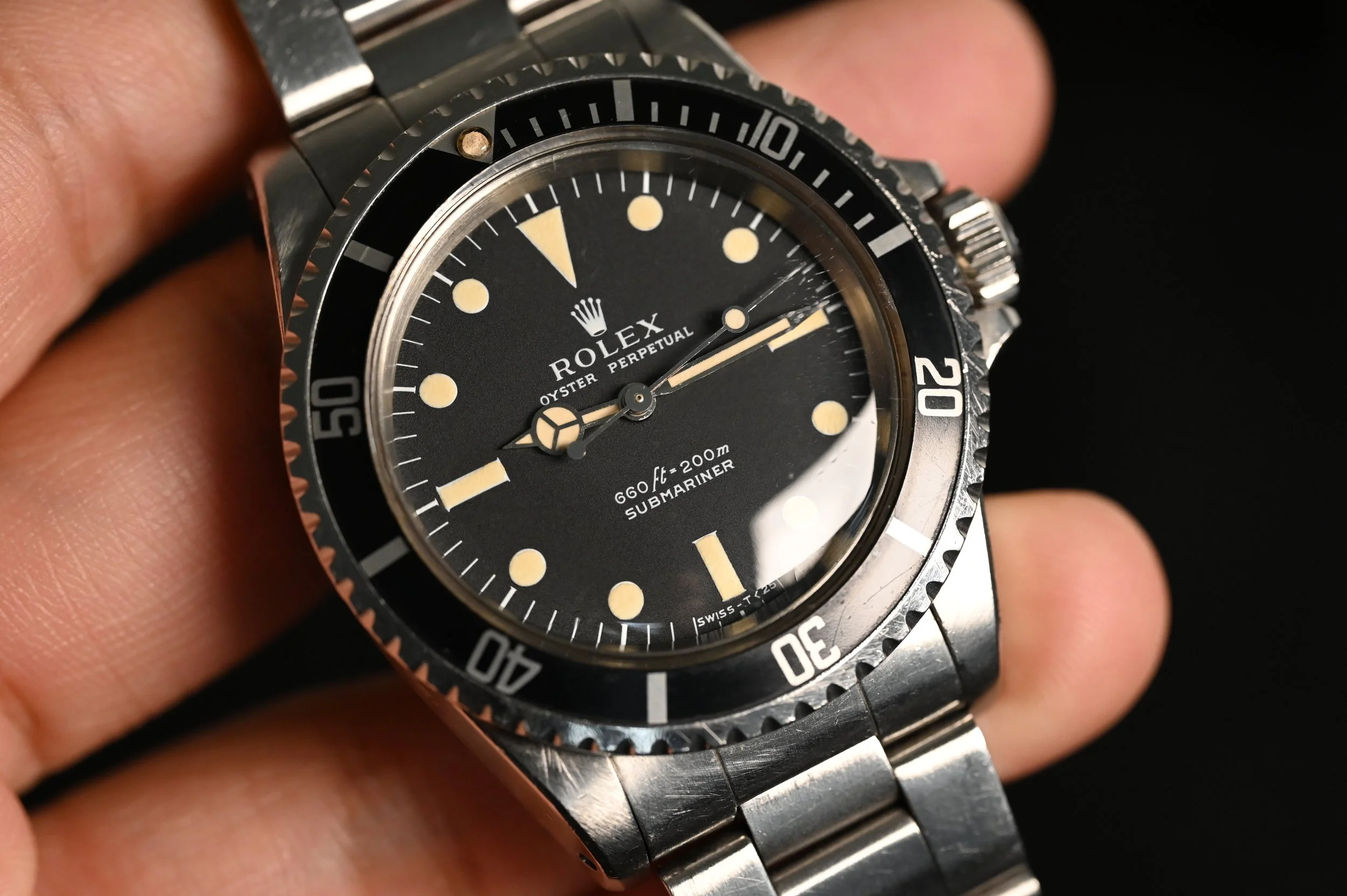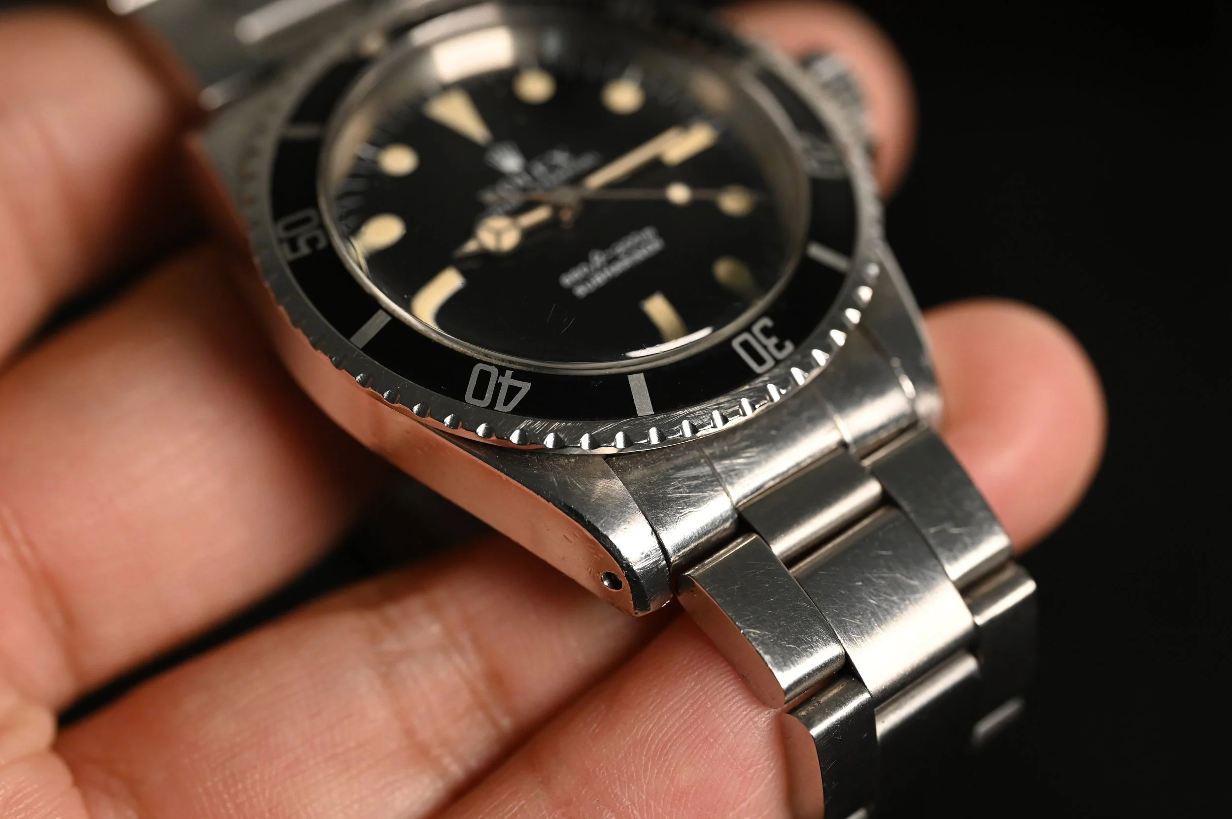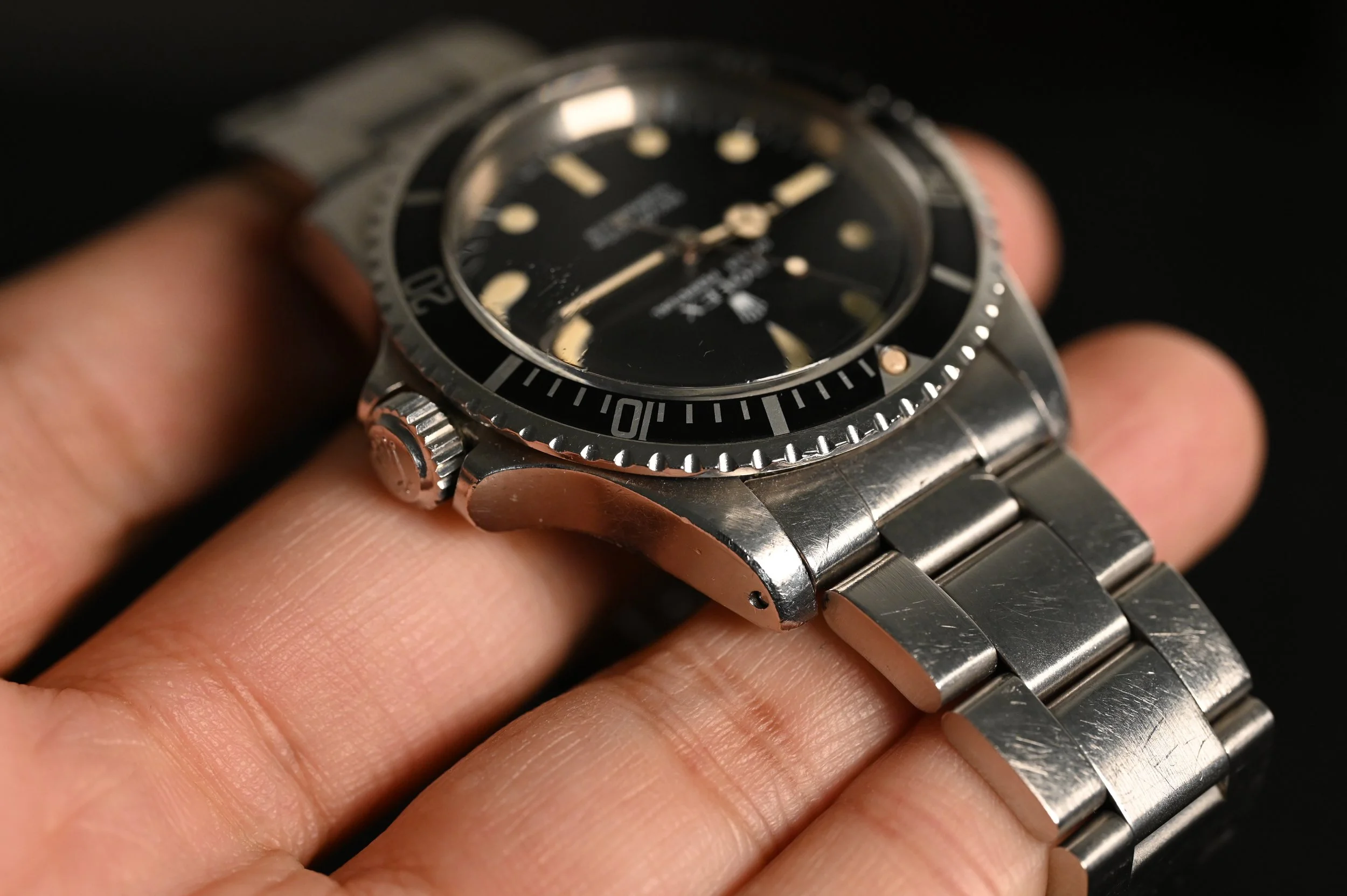 What truly makes this 5513 stand out is the outstanding condition of its 3.8 million serial case, which retains all its original chamfers and finishing - a testament to the preservation by the owner. The original super dome crystal, with its halo effect, beautifully catches light, revealing a stunning light cream patina that adds to its vintage allure.